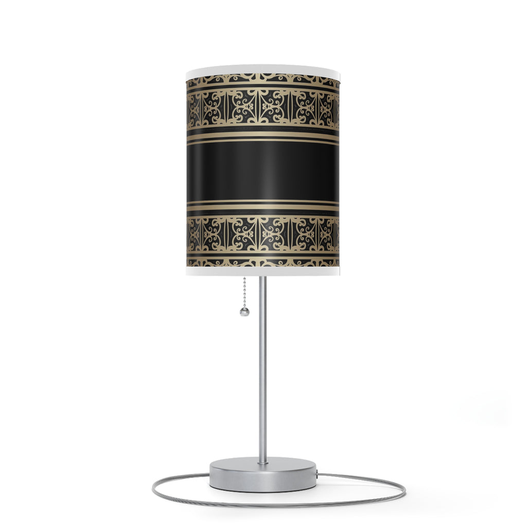 20" Silver Table Lamp With Black And Gold Striped Scroll Cylinder Shade