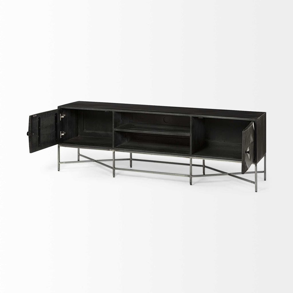 This is a media console made from Indian mango wood with embossed diamond pattern doors.|Dark Brown Solid Mango Wood Finish TV Stand Media Console With 2 Doors And 2 Open Shelves