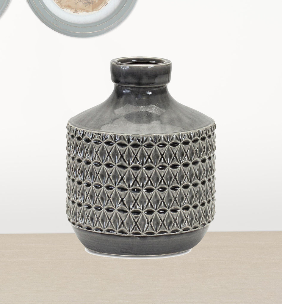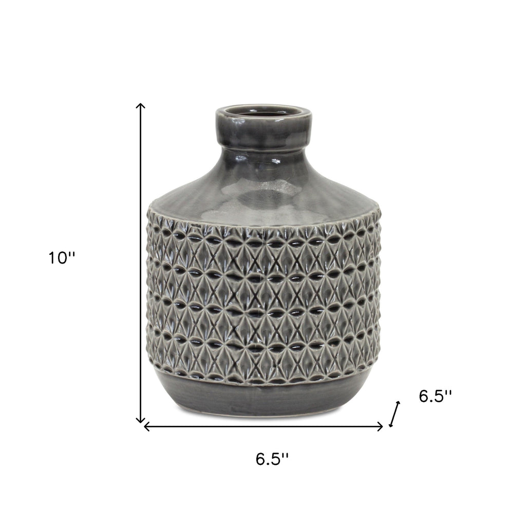 Add a touch of industrial charm to your home decor with this stunning round table vase. Crafted from high-quality terracotta, this vase boasts a sleek black color that adds a stylish finish to any room. With its geometric pattern, this vase is a perfect way to showcase your favorite flowers or can simply be displayed as an eye-catching centerpiece. Standing at 10 inches tall with a width and depth of 6.5 inches, this vase is a versatile piece that can be placed on any table or shelf. Whether you have a modern or traditional style, this industrial-inspired vase is sure to elevate your space with its unique design.