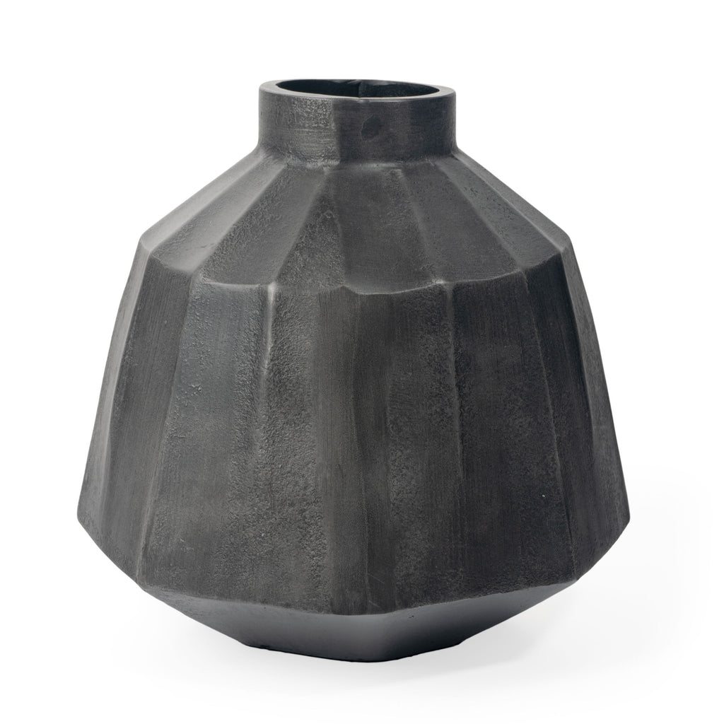 This 10-inch dark gray geometric organic stripe round aluminum table vase is the perfect addition to your modern home decor. Crafted from durable rough hewn cast aluminum, this round vase features a stunning dark chalky gray finish that adds a touch of warmth to any room. Its unique geometric faceted stripe design is sure to catch the eye and create a stylish centerpiece. The handcrafted style works well to create a sense of earthiness and bring some dimension and texture to your space. 11-inch H x 11-inch W x 11-inch D