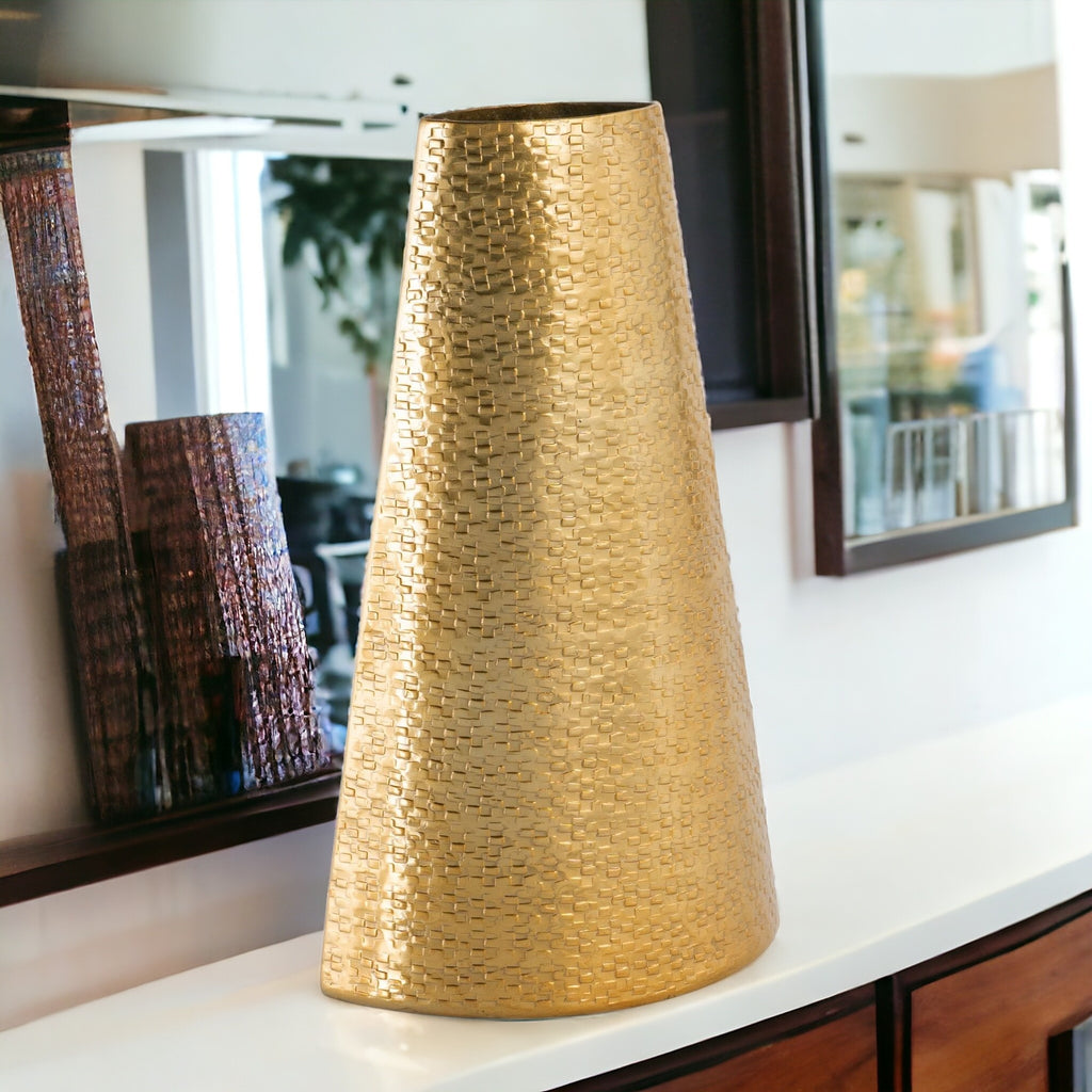 Enhance your home decor with this exquisite 14-inch gold cylinder cone metal table vase. Crafted from high-quality cast aluminum, this vase features a unique sleek shape and a warm textural hammered golden coloration. The uncommon shape adds visual interest and makes it a striking centerpiece for your table or shelf. This modern vase is the perfect addition to any room, whether it's your living room, dining area, or bedroom. Elevate your decor with this stunning and versatile table vase. 14-inch H x 8-inch W x 5-inch D