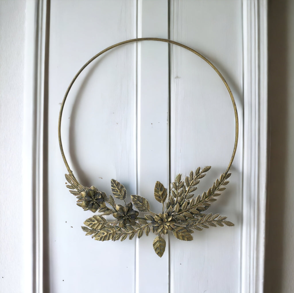 This gorgeous wreath is loaded with artificial florals that ensure it will last for multiple seasons. This lovely wreath makes a wonderful gift and is sure to brighten someone's day. Crafted in a circular shape, this wreath features a mixed assortment of artificial plants for a natural and vibrant look. With a gold metal construction, it adds an elegant touch to any space. Designed for covered outdoor use, this unlit wreath is perfect for decorating your front door or porch. Its generous hole diameter of 10 inches allows for easy installation. The casual style of this wreath complements any home decor effortlessly. 14.5-inch H x 12-inch W x 1-inch D