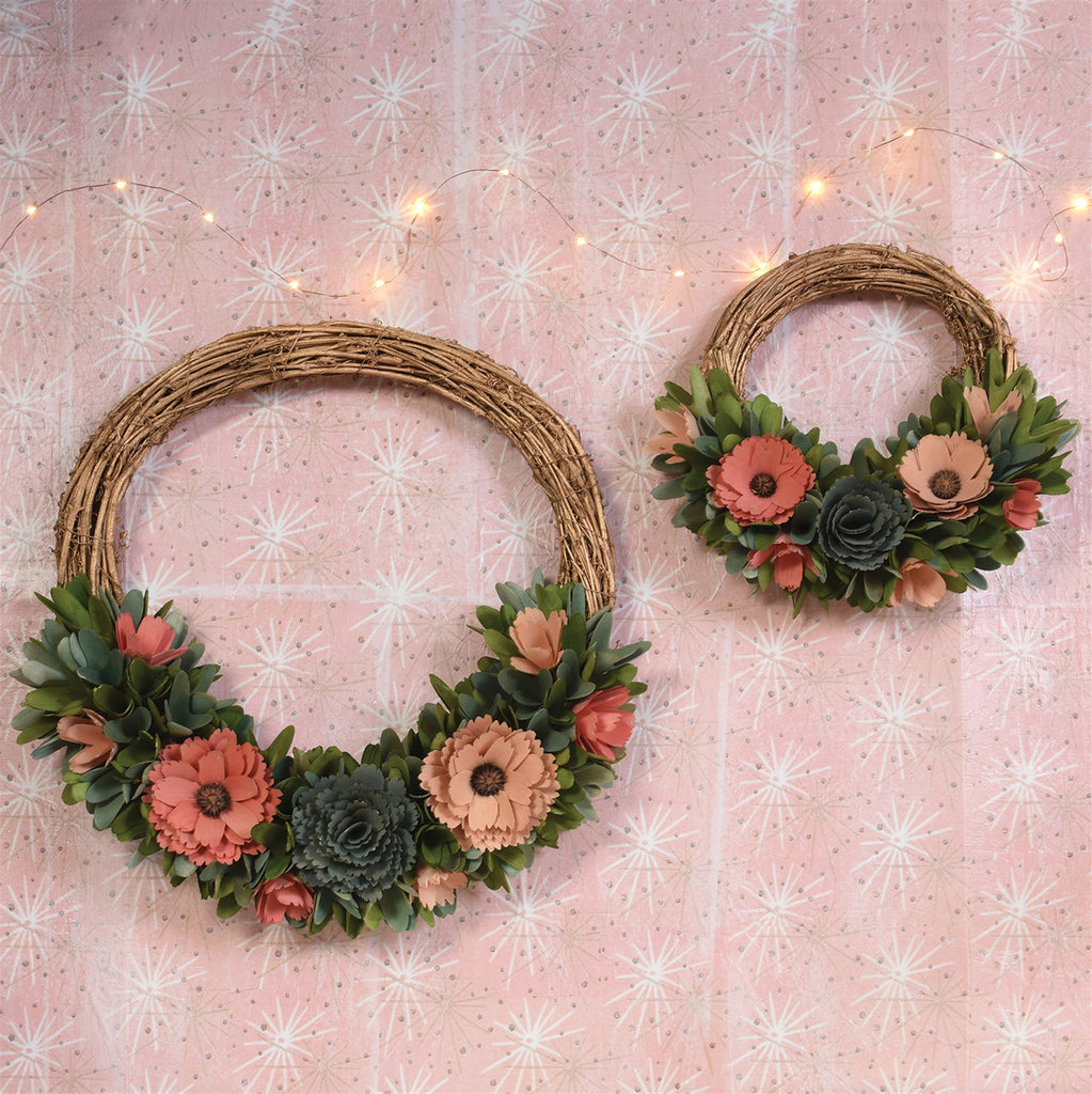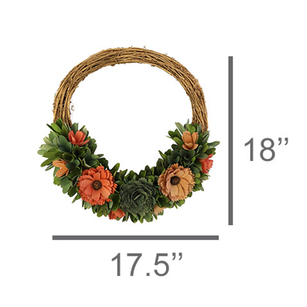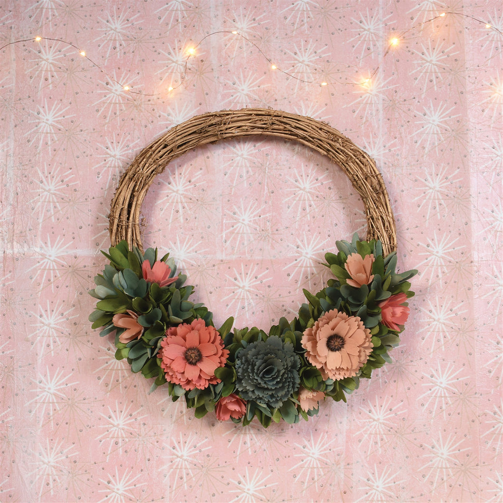 Made to mimic the real thing, this artificial wreath features wood twigs and florals with no watering needed. This lovely wreath makes a wonderful gift and is sure to brighten someone's day. Crafted in a circular shape, this wreath features a mixed assortment of artificial plant species, creating a stunning and vibrant display of pink and green. Perfect for covered outdoor use, this unlit wreath includes a hole diameter of 11.5 inches, making it easy to hang on any door or wall. Made from durable wood material, this casual-style wreath adds a touch of natural beauty to any home. 18-inch H x 17.5-inch W x 3.5-inch D