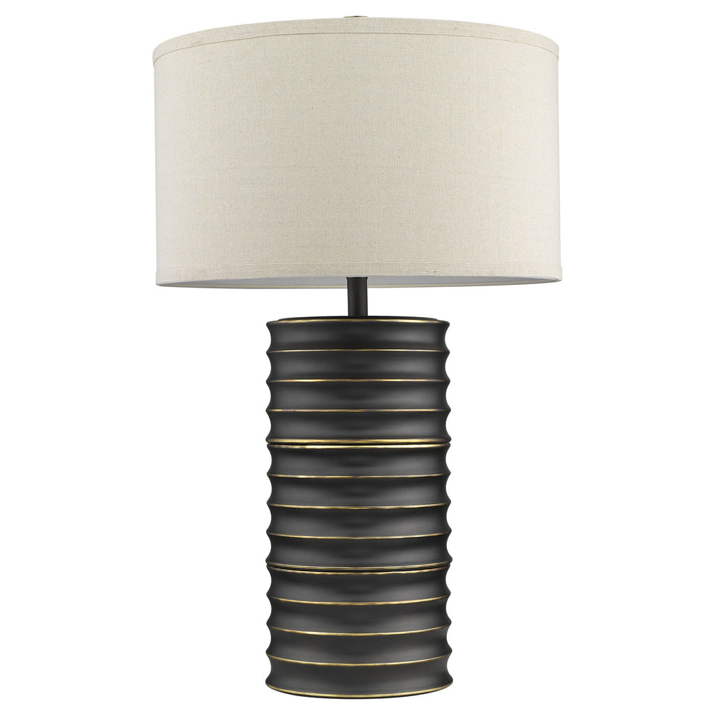 Bring of level of elegance and freshness to your space with this high quality 29" black ceramic column table lamp with off white drum shade. The base of this lamp is made of black ceramic. The off white shade has a drum shape and is made from fabric. High quality design makes this a great lamp for not only lighting, but accenting a room with style. It is perfect for virtually any decor. 29" H x 17.5" W x 17.5" D