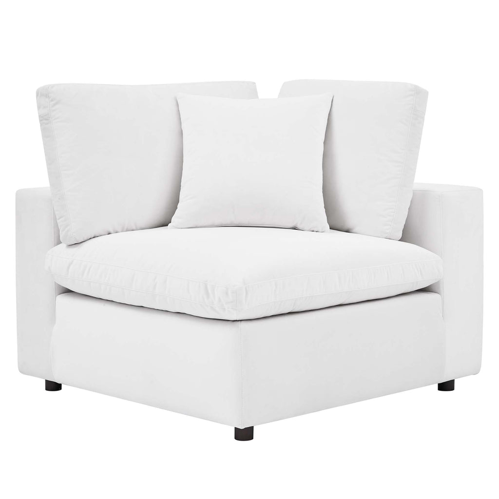 A haven for cozy relaxation, Commix features plush comfort, clean-lined design, and spacious profile, that makes an attractive statement in the modern home. Covered in stain-resistant performance velvet, this upholstered sofa comes with a solid wood construction and foam padded and duck down cushions for a luxurious sink-in feel. Commix features overstuffed down feather cushions that offer a feeling of relaxation and calming comfort while lounging, making it the perfect addition to the living room, family room, or game room. Made for sprawling out or curling up, Commix beckons you and guests to sit and stay a while. Includes plastic foot glides. Weight Capacity of Each Piece: 331 lbs. Set Includes: Two - Commix Down Filled Overstuffed Armless Chair Two - Commix Down Filled Overstuffed Corner Chair
