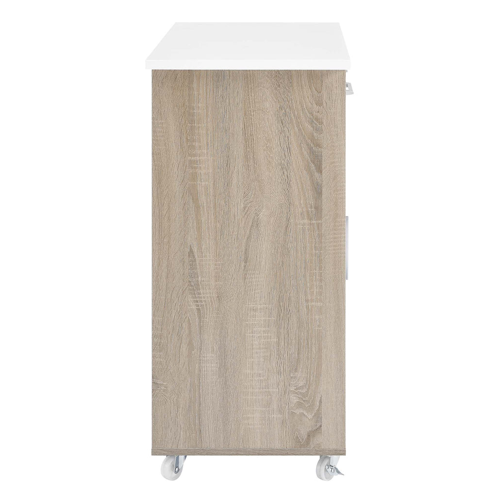 Experience the perfect blend of functionality and elegance with the Culinary Kitchen Cart. Crafted with particleboard and adorned with a beautiful paper laminate, this kitchen island cart brings a natural aesthetic to your home or apartment. Equipped with four nylon casters with side lock brakes, this rolling cart glides effortlessly wherever you need it. Set up a coffee nook or organize your kitchen essentials using its two full-glide drawers, two open shelves, and two storage shelves tucked neatly behind an elegantly hinged glass-front door. From small appliances to pots, pans, and cooking utensils, this kitchen cart with wheels provides ample storage space to keep your kitchen neat and tidy and even includes a convenient spice rack on its side. The Culinary Coffee Bar Cabinet is a versatile small kitchen island that complements modern kitchen furniture and decor. Assembly required. Tabletop Weight Capacity: 276 lbs; Shelf Weight Capacity: 44 lbs. Set Includes: One - Culinary Kitchen Cart With Spice Rack