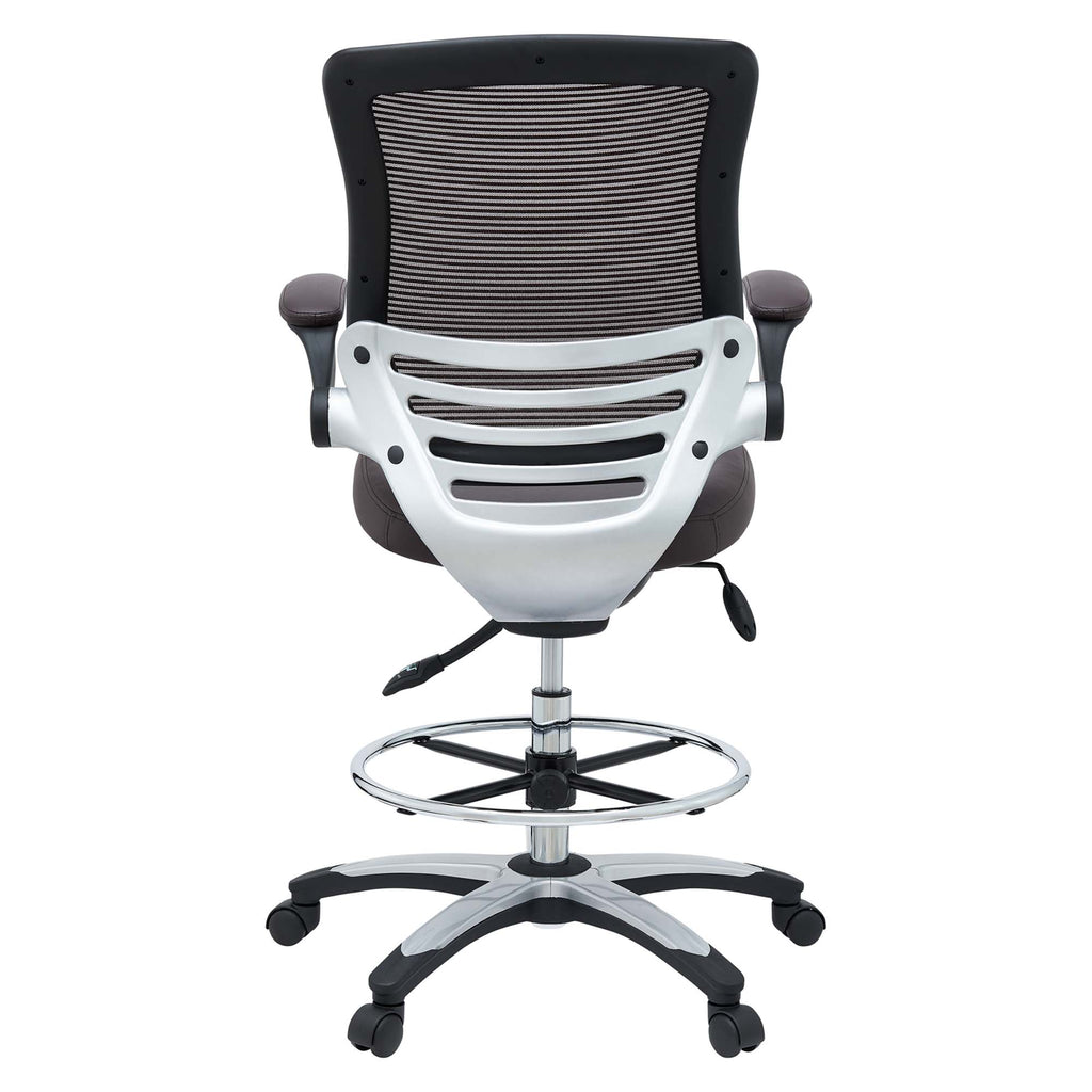 Welcome to a new era in functional comfort. The Edge Drafting Stool implements cutting edge ergonomics to deliver a comprehensive seating experience. Edge features a breathable mesh back for lower back lumbar support, padded waterfall vinyl seat to ease pain and pressure around your thighs, flip-up padded arms, an extra tall gas cylinder with a footring, and it securely locks in place with a user-friendly seat tilt plus tension control knob. Edge is a progressively minded drafting stool perfect for school, work, or home use. Set Includes: One - Edge Office Drafting Chair with Foot Ring, Mesh Back and Black Leatherette Seat