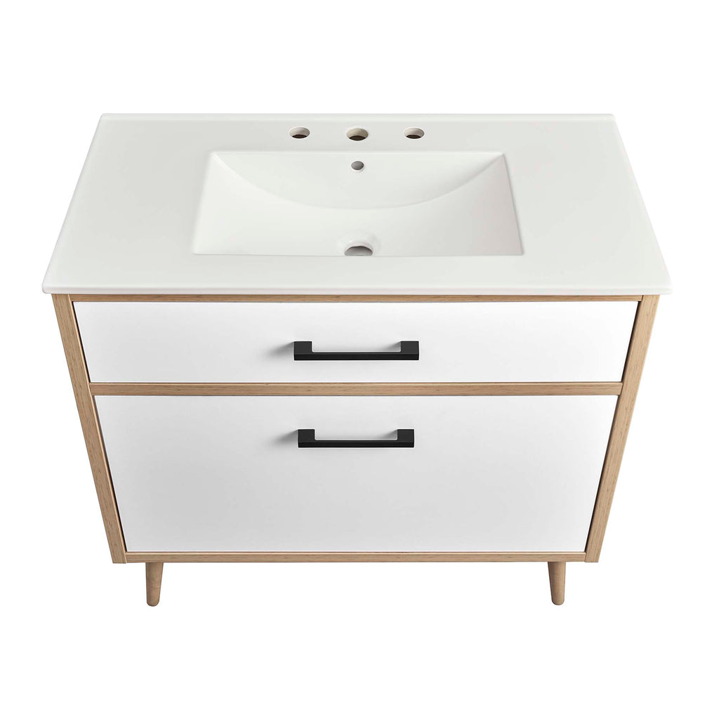 The Maverick 36" Bathroom Vanity is the perfect blend of modern style and convenience. Crafted with particleboard and melamine, the simple yet elegant design is enhanced by modern metal handle pulls and tapered and splayed rubberwood legs. The spacious full-glide bottom drawer provides plenty of storage space for all your bathroom essentials, while the fixed top drawer adds complementing style. This bathroom vanity cabinet features a ceramic sink basin with an integrated countertop and 8" centerset faucet holes. This bathroom vanity instantly transforms your space, creating a beautiful, modern look that will last for years. Includes non-marking foot glides to protect flooring. Assembly required. Fixtures not included. Set Includes: One - Cayman 36" Bathroom Sink One - Maverick 36" Bathroom Vanity Cabinet - Sink Basin Not Included
