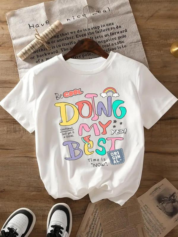 Women's Cartoon & Letter Print Round Neck Tee, Fashion Casual Crew Neck T-shirt for Daily Holiday Vacation Outdoor Wear, Women's Tops for Spring & Fall