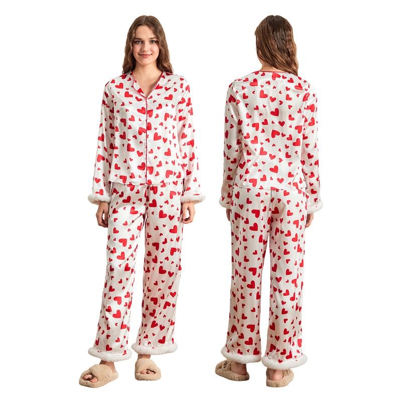 Women's Valentine's Day Lounge Set Long Sleeve Button Up Heart Print Tops Pants Sleepwear Sets